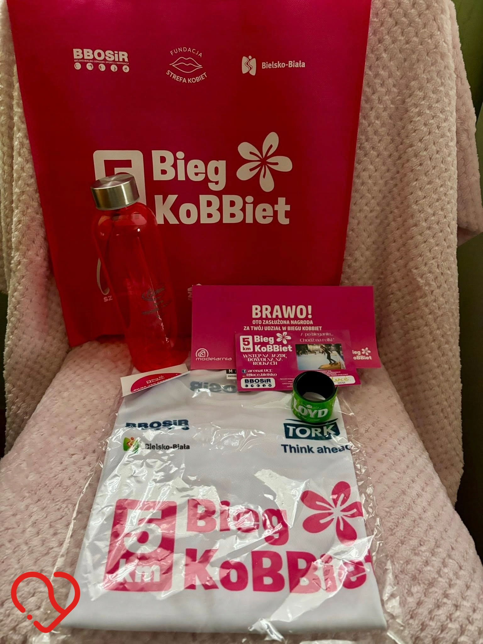 Zestaw zawiera pakiet startowy z Biegu KoBBiet w Bielsku Białej i zawiera: koszulka rozmiar M, torba na zakupy, butelka na wodę, odblask i vouchery